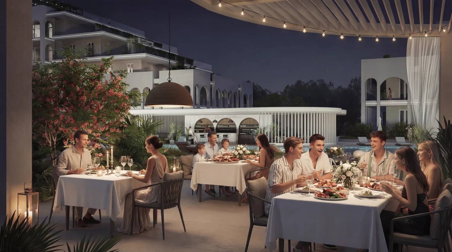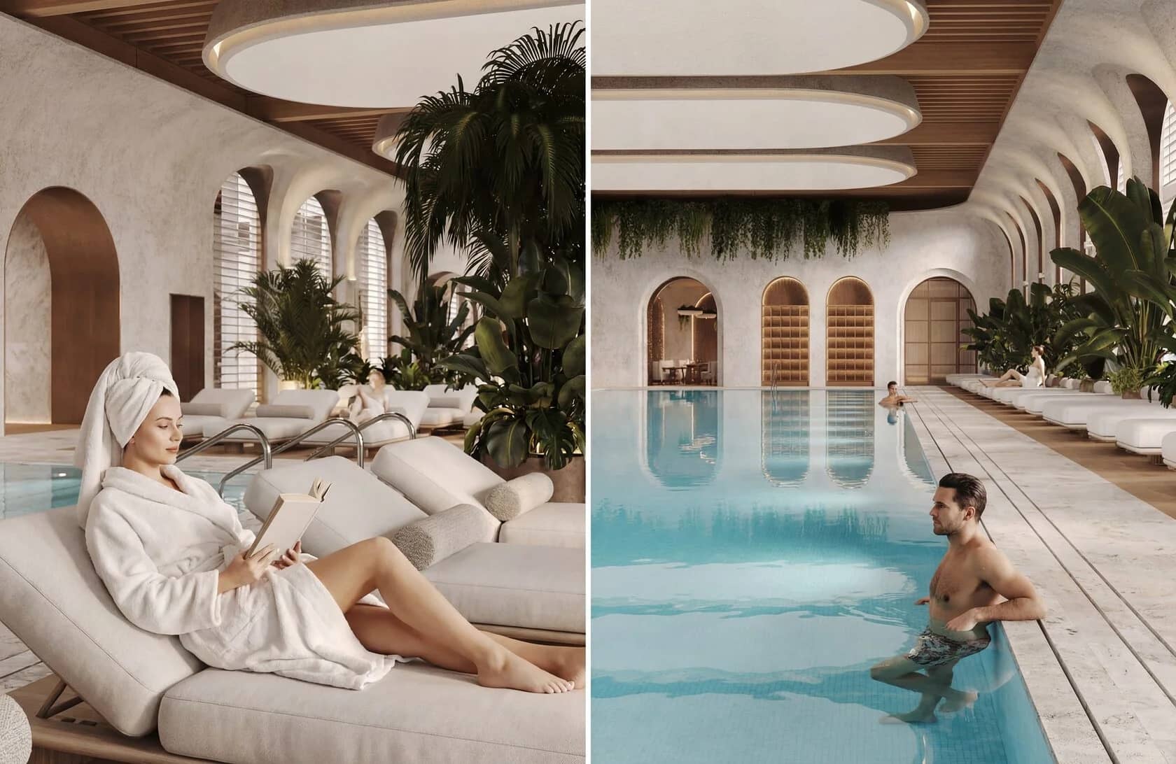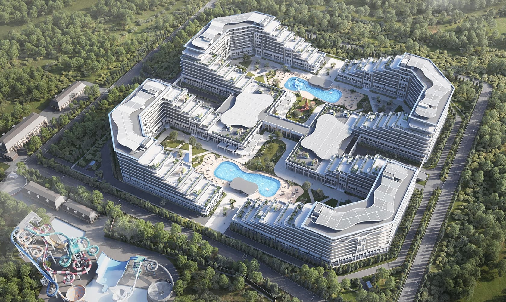 ● СПА-центр ● Банный комплекс ● Хаммам ● Два бассейна под открытым небом ● Фитнес-клуб ● Рестораны ● Кинотеатр ● Коворкинг ● Площадки ● Термальные источники ● Игровые площадкии